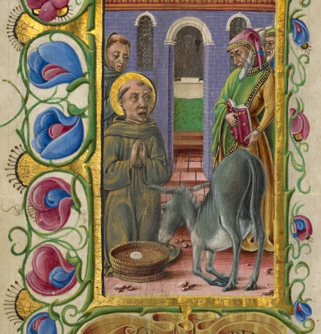 The Franciscan friar Saint Anthony of Padua kneels in prayer while a mule bows down before a basket in front of him. Although the mule had been fasting for three days, the animal ignores the wheat in the basket and kneels respectfully before the consecrated Eucharist placed on top of the wheat. According to legend, this miracle took place in Toulouse.